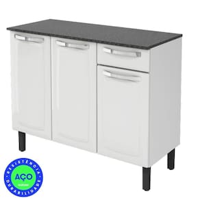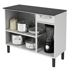 CARACTERÍSTICAS - Cor: Branco Neve - Material da Estrutura: Aço - Quantidade de Portas no armário: 3 - Quantidade de Portas no balcão: 3 - Quantidade de Gavetas: 1 - Quantidade de Pés no balcão: 4 - Acompanha tampo: Sim