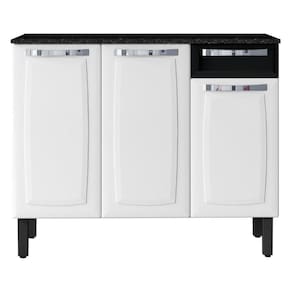 CARACTERÍSTICAS - Cor: Branco/ Preto - Material da Estrutura: Aço - Quantidade de Portas no armário: 3 - Quantidade de Portas no balcão: 3 - Quantidade de Gavetas: 1 - Quantidade de Pés no balcão: 4 - Acompanha tampo: Sim