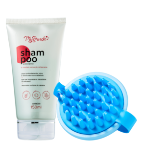 Kit My Brush Esfoliante Azul com shampoo e escova de cabelo. Promove uma limpeza intensa, que purifica e realça a beleza dos fios.