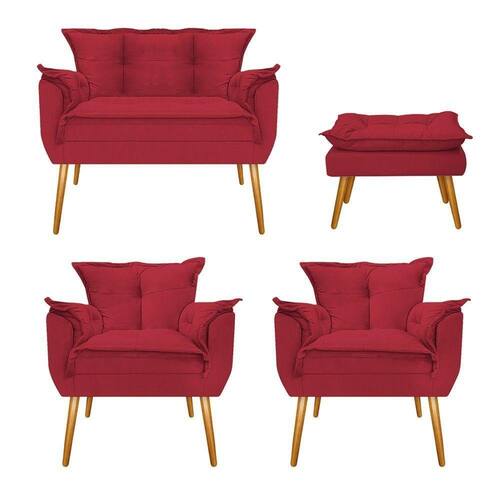 Gostaria de um móvel que trouxesse mais elegância e sofisticação para o seu lar? O Kit Namoradeira, 02 Poltronas e Puff Opala é sua melhor opção! Com característica moderna e com acabamento de qualidade, este produto atenderá suas expectativas! Não perca essa oportunidade e adquira já a sua! Especificações Técnicas da Namoradeira Decorativa Opala: - Altura: 90 cm; - Largura: 120 cm; - Profundidade: 70 cm; - Altura do Assento: 45 cm; - Altura do Braço: 65 cm; - Largura do Assento: 95 cm; - Profundidade do Assento: 50 cm; - Largura do Encosto: 95 cm; - Altura do Encosto: 40 cm; - Espessura do Assento: 26 cm; - Espessura do Encosto: 15 cm; - Altura dos Pés: 30 cm; - Peso: 20 kg. - Peso Suportado: 120 kg. Especificações Técnicas da Poltrona Decorativa Opala: - Altura: 95 cm; - Largura: 80 cm; - Profundidade: 70 cm; - Altura do Assento: 50 cm; - Altura do Braço: 70 cm; - Largura do Assento: 45 cm; - Profundidade do Assento: 50 cm; - Espessura do Assento: 26 cm; - Altura do Encosto: 40 cm; - Largura do Encosto: 65 cm; - Espessura do Encosto: 15 cm; - Altura dos Pés: 30 cm; - Peso: 20 kg. - Peso Suportado: 120 kg. Especificações Técnicas do Puff Decorativo Opala: - Altura: 50 cm; - Largura: 45 cm; - Altura dos Pés: 30 cm; - Peso: 15 kg. - Peso Suportado: 120 kg. Diferenciais do Kit Namoradeira, 02 Poltronas e Puff Opala: - Material da Estrutura: fabricado com Madeira Pinus e Eucalipto Reflorestada, e alguns detalhes em MDF; - Tipo de Assento: estofado e com espuma de densidade D-26; - Tipo de Encosto: estofado e com espuma de densidade D-18; - Detalhes dos Pés: acompanha kit de pés (4 pés para cada produto) de madeira, no estilo palito na cor mel, com alta resistência; - Volumes: nessa compra você receberá UMA NAMORADEIRA, DUAS POLTRONAS E UM PUFF. ATENÇÃO: a transportadora pode entregá-los juntos ou separados, nesse último caso, inclusive com dias de diferença na entrega. Recomendações de limpeza: -Limpar com flanela limpa e seca. Não molhar o móvel e não expor em lugar úmido ou próximo de fontes de calor. Não usar produtos abrasivos. Observações Importantes: - As imagens ambientadas são meramente ilustrativas e podem apresentar itens que não compõe o produto; - Objetos decorativos que aparecem na foto não acompanham o produto; - As cores do produto podem variar de acordo com o monitor, a iluminação do ambiente, ou sua percepção visual; - Namoradeira Decorativa Opala chegará montada para você, bastando rosquear os pés; - A Poltrona Decorativa Opala chegará montado para você, bastando rosquear os pés; - O Puff Decorativo Opala chegará montado para você, bastando rosquear os pés; - Confira as dimensões antes da compra e certifique-se de que o produto passará por elevadores, portas e corredores, já que nossa entrega não inclui a subida de lances de escada, ou o lançamento de produtos; - Ao receber seus produtos, verifique no ato do recebimento qualquer dano na embalagem. Caso tenha alguma avaria, favor não assinar o comprovante de recebimento (A transportadora tem obrigação de esperar a conferência); - Produto para uso residencial em ambiente interno, não devendo ficar exposto diretamente ao sol, calor e umidades excessivas.