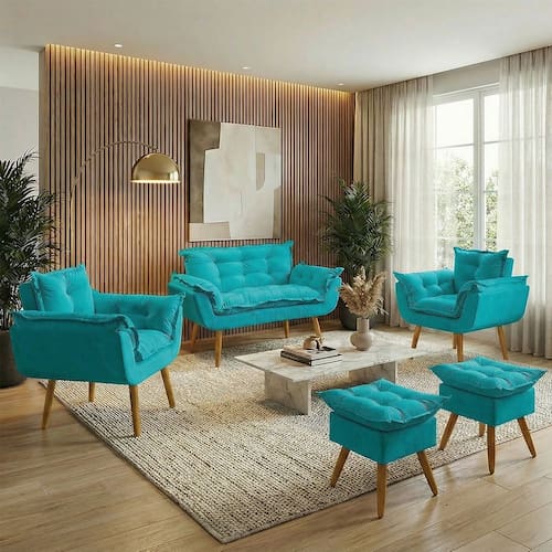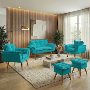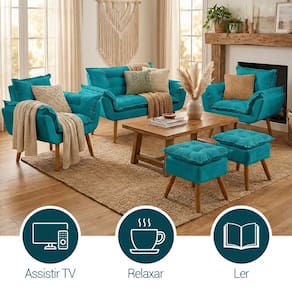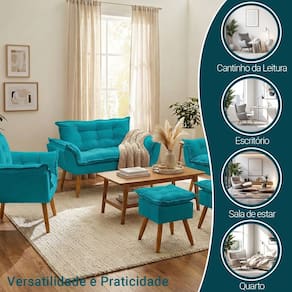 Kit Namoradeira 2 Poltronas e 2 Puffs Confortável Para Sala Recepção Manicure Consultório Alice Suede - Azul Turquesa
