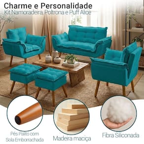 Fabricado com madeira maciça de eucalipto, o Kit Alice garante durabilidade e resistência. O assento e encosto possuem enchimento em fibra mista, proporcionando maciez e conforto excepcionais. Revestido em tecido suede, oferece um toque macio e sofisticado. Seus pés, em madeira na tonalidade castanho, possuem design moderno e estável, trazendo charme e elegância ao ambiente. Com capacidade para até 120 kg na poltrona e namoradeira, e 90 kg no puff, é a escolha ideal para quem busca qualidade, conforto e estilo.