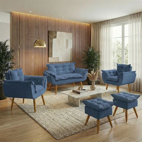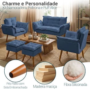 Fabricado com madeira maciça de eucalipto, o Kit Alice garante durabilidade e resistência. O assento e encosto possuem enchimento em fibra mista, proporcionando maciez e conforto excepcionais. Revestido em tecido suede, oferece um toque macio e sofisticado. Seus pés, em madeira na tonalidade castanho, possuem design moderno e estável, trazendo charme e elegância ao ambiente. Com capacidade para até 120 kg na poltrona e namoradeira, e 90 kg no puff, é a escolha ideal para quem busca qualidade, conforto e estilo.