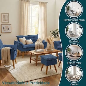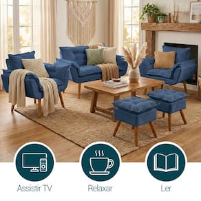 Kit Namoradeira 2 Poltronas e 2 Puffs Confortável Para Sala Recepção Manicure Consultório Alice Suede - Azul Marinho