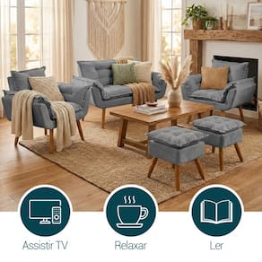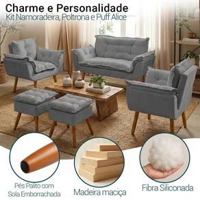 Fabricado com madeira maciça de eucalipto, o Kit Alice garante durabilidade e resistência. O assento e encosto possuem enchimento em fibra mista, proporcionando maciez e conforto excepcionais. Revestido em tecido suede, oferece um toque macio e sofisticado. Seus pés, em madeira na tonalidade castanho, possuem design moderno e estável, trazendo charme e elegância ao ambiente. Com capacidade para até 120 kg na poltrona e namoradeira, e 90 kg no puff, é a escolha ideal para quem busca qualidade, conforto e estilo.