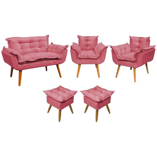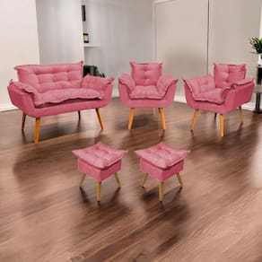 Fabricado com madeira maciça de eucalipto, o Kit Alice garante durabilidade e resistência. O assento e encosto possuem enchimento 100% em fibra siliconada, proporcionando maciez e conforto excepcionais. Revestido em tecido suede, oferece um toque macio e sofisticado. Seus pés, em madeira na tonalidade castanho, possuem design moderno e estável, trazendo charme e elegância ao ambiente. Com capacidade para até 120 kg na poltrona e namoradeira, e 100 kg no puff, é a escolha ideal para quem busca qualidade, conforto e estilo.