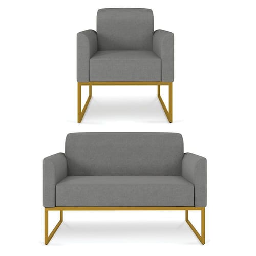 O momento em que decidimos mobiliar nossa casa é um evento muito especial, pois representa o que gostamos e o que irá refletir através dos móveis que irão compor cada espaço do nosso Lar.Cada escolha é uma oportunidade de imprimir o que sentimos, e para Sala de Estar desejamos conforto e beleza, para a hora de um bate-papo ou um belo café da tarde. O Kit Namoradeira e 1 Poltrona Decorativa Base Industrial Dourada Maressa A26 Linho Grafite - Ibiza pode transformar seu ambiente em algo único, sua estrutura em metal é firme e com fino acabamento, o estofado é macio e traz a leveza que o Estilo Industrial pode fazer em sua essência.Faça uma escolha inteligente e adquira conosco este Conjunto de Poltrona Namoradeira e Poltrona Decorativa, um toque de classe para o seu cantinho favorito.EspecificaçõesDimensões do Produto(Largura x Altura x Profundidade):Namoradeira: 113 x 76 x 64 cm.Poltrona: 65 x 77 x 64 cm.Peso: 33 kg.Outras MedidasProfundidade do assento: 46 cm.Largura do assento: 95 cm.Altura do assento ao chão: 44 cm.Altura do encosto: 35 cm.Altura Interna do Braço: 18 cm.Altura dos pés: 30 cm.Características do ProdutoMaterial da Estrutura: Madeira reflorestada de Eucalipto..Material da Espuma: Espuma D-28 no assento e encosto e D-23 nos braços..Peso Suportado: Até 360 Kg.Revestimento: Linho.Tipo de Encosto: Fixo.Tipo de Assento: Fixo.Quantidade de Lugares: 3 Lugares.Possui Pés: Sim.Material dos Pés: Base Industrial.Diferenciais:- Design moderno.- Percintas elásticas no assento.Sistema de Montagem: O produto é enviado montado, sendo necessário apenas fixar a base.Volumes: 3 Volumes.Conteúdo da Embalagem: 1 Namoradeira e 1 Poltrona Decorativa.Garantia do Fabricante: 90 dias contra defeito de fabricação.Montagem: Recomendamos que seja feita por um profissional.Recomendação de Limpeza: Utilize pano levemente úmido.Observações importantes:- Produto para uso residencial em ambiente interno, não devendo ficar exposto diretamente ao sol, calor e umidades excessivas.- Pode haver alguma diferença de tonalidade entre a imagem e o produto real, por conta do tratamento de imagens e a calibração de cores do seu monitor.- As imagens são meramente ilustrativas, não acompanham objetos de decoração e eletrônicos.- Confira o estado da embalagem, não devendo assinar o comprovante em caso de danos.- Não asseguramos, no ato da entrega, por subir escadas/elevadores, pelo transporte por guincho em apartamentos ou montagem, desmontagem e instalações. Eventuais despesas são por conta do comprador.- Confira as dimensões do produto e certifique-se de que passará normalmente por supostos elevadores, portas, escadas e/ou corredores de sua residência.