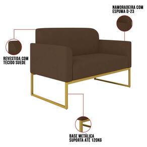 O momento em que decidimos mobiliar nossa casa é um evento muito especial, pois representa o que gostamos e o que irá refletir através dos móveis que irão compor cada espaço do nosso Lar.Cada escolha é uma oportunidade de imprimir o que sentimos, e para Sala de Estar desejamos conforto e beleza, para a hora de um bate-papo ou um belo café da tarde. O Kit Namoradeira e 1 Poltrona Decorativa Base Industrial Dourada Maressa S06 Suede Marrom - Ibiza pode transformar seu ambiente em algo único, sua estrutura em metal é firme e com fino acabamento, o estofado é macio e traz a leveza que o Estilo Industrial pode fazer em sua essência.Faça uma escolha inteligente e adquira conosco este Conjunto de Poltrona Namoradeira e Poltrona Decorativa, um toque de classe para o seu cantinho favorito.EspecificaçõesDimensões do Produto:Poltrona (L x A x P): 65 x 77 x 64 cm.Namoradeira (L x A x P): 113 x 76 x 64 cm.Profundidade do assento: 46 cm.Largura do assento: 95 cm.Altura do assento ao chão: 44 cm.Altura do encosto: 35 cm.Altura Interna do Braço: 18 cm.Altura dos pés: 30 cm.Peso: 33 kg.Características do ProdutoMaterial da Estrutura: Madeira reflorestada de Eucalipto..Material da Espuma: Espuma D-28 no assento e encosto e D-23 nos braços..Peso Suportado: Até 360 Kg.Revestimento: Suede.Tipo de Encosto: Fixo.Tipo de Assento: Fixo.Quantidade de Lugares: 3 Lugares.Possui Pés: Sim.Material dos Pés: Base Industrial.Diferenciais:- Design moderno.- Percintas elásticas no assento.Sistema de Montagem: O produto é enviado montado, sendo necessário apenas fixar a base.Volumes: 3 Volumes.Conteúdo da Embalagem: 1 Namoradeira e 1 Poltrona Decorativa.Garantia do Fabricante: 90 dias contra defeito de fabricação.Montagem: Recomendamos que seja feita por um profissional.Recomendação de Limpeza: Utilize pano levemente úmido.Observações importantes:- Produto para uso residencial em ambiente interno, não devendo ficar exposto diretamente ao sol, calor e umidades excessivas.- Pode haver alguma diferença de tonalidade entre a imagem e o produto real, por conta do tratamento de imagens e a calibração de cores do seu monitor.- As imagens são meramente ilustrativas, não acompanham objetos de decoração e eletrônicos.- Confira o estado da embalagem, não devendo assinar o comprovante em caso de danos.- Não asseguramos, no ato da entrega, por subir escadas/elevadores, pelo transporte por guincho em apartamentos ou montagem, desmontagem e instalações. Eventuais despesas são por conta do comprador.- Confira as dimensões do produto e certifique-se de que passará normalmente por supostos elevadores, portas, escadas e/ou corredores de sua residência.