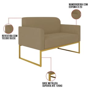 O momento em que decidimos mobiliar nossa casa é um evento muito especial, pois representa o que gostamos e o que irá refletir através dos móveis que irão compor cada espaço do nosso Lar.Cada escolha é uma oportunidade de imprimir o que sentimos, e para Sala de Estar desejamos conforto e beleza, para a hora de um bate-papo ou um belo café da tarde. O Kit Namoradeira e 1 Poltrona Decorativa Base Industrial Dourada Maressa S12 Suede Marrom Rato - Ibiza pode transformar seu ambiente em algo único, sua estrutura em metal é firme e com fino acabamento, o estofado é macio e traz a leveza que o Estilo Industrial pode fazer em sua essência.Faça uma escolha inteligente e adquira conosco este Conjunto de Poltrona Namoradeira e Poltrona Decorativa, um toque de classe para o seu cantinho favorito.EspecificaçõesDimensões do Produto(Largura x Altura x Profundidade):Namoradeira: 113 x 76 x 64 cm.Poltrona: 65 x 77 x 64 cm.Peso: 33 kg.Outras MedidasProfundidade do assento: 46 cm.Largura do assento: 95 cm.Altura do assento ao chão: 44 cm.Altura do encosto: 35 cm.Altura Interna do Braço: 18 cm.Altura dos pés: 30 cm.Características do ProdutoMaterial da Estrutura: Madeira reflorestada de Eucalipto..Material da Espuma: Espuma D-28 no assento e encosto e D-23 nos braços..Peso Suportado: Até 360 Kg.Revestimento: Suede.Tipo de Encosto: Fixo.Tipo de Assento: Fixo.Quantidade de Lugares: 3 Lugares.Possui Pés: Sim.Material dos Pés: Base Industrial.Diferenciais:- Design moderno.- Percintas elásticas no assento.Sistema de Montagem: O produto é enviado montado, sendo necessário apenas fixar a base.Volumes: 3 Volumes.Conteúdo da Embalagem: 1 Namoradeira e 1 Poltrona Decorativa.Garantia do Fabricante: 90 dias contra defeito de fabricação.Montagem: Recomendamos que seja feita por um profissional.Recomendação de Limpeza: Utilize pano levemente úmido.Observações importantes:- Produto para uso residencial em ambiente interno, não devendo ficar exposto diretamente ao sol, calor e umidades excessivas.- Pode haver alguma diferença de tonalidade entre a imagem e o produto real, por conta do tratamento de imagens e a calibração de cores do seu monitor.- As imagens são meramente ilustrativas, não acompanham objetos de decoração e eletrônicos.- Confira o estado da embalagem, não devendo assinar o comprovante em caso de danos.- Não asseguramos, no ato da entrega, por subir escadas/elevadores, pelo transporte por guincho em apartamentos ou montagem, desmontagem e instalações. Eventuais despesas são por conta do comprador.- Confira as dimensões do produto e certifique-se de que passará normalmente por supostos elevadores, portas, escadas e/ou corredores de sua residência.