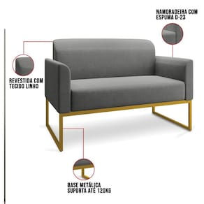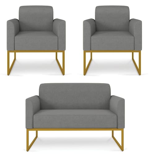 O momento em que decidimos mobiliar nossa casa é um evento muito especial, pois representa o que gostamos e o que irá refletir através dos móveis que irão compor cada espaço do nosso Lar.Cada escolha é uma oportunidade de imprimir o que sentimos, e para Sala de Estar desejamos conforto e beleza, para a hora de um bate-papo ou um belo café da tarde. O Kit Namoradeira e 2 Poltronas Decorativas Base Industrial Dourada Maressa A26 Linho Grafite - Ibiza pode transformar seu ambiente em algo único, sua estrutura em metal é firme e com fino acabamento, o estofado é macio e traz a leveza que o Estilo Industrial pode fazer em sua essência.Faça uma escolha inteligente e adquira conosco este Conjunto de Poltrona Namoradeira e Poltrona Decorativa, um toque de classe para o seu cantinho favorito.EspecificaçõesDimensões do Produto (Largura x Altura x Profundidade):Namoradeira: 113 x 76 x 64 cm.Poltronas: 65 x 77 x 64 cm.Peso: 46 kg.Outras MedidasProfundidade do assento: 46 cm.Largura do assento: 95 cm.Altura do assento ao chão: 44 cm.Altura do encosto: 35 cm.Altura Interna do Braço: 18 cm.Altura dos pés: 30 cm.Características do ProdutoMaterial da Estrutura: Madeira reflorestada de Eucalipto..Material da Espuma: Espuma D-28 no assento e encosto e D-23 nos braços..Peso Suportado: Até 480 Kg.Revestimento: Linho.Tipo de Encosto: Fixo.Tipo de Assento: Fixo.Quantidade de Lugares: 4 Lugares.Possui Pés: Sim.Material dos Pés: Base Industrial.Diferenciais:- Design moderno.- Percintas elásticas no assento.Sistema de Montagem: O produto é enviado montado, sendo necessário apenas fixar a base.Volumes: 4 Volumes.Conteúdo da Embalagem: 1 Namoradeira e 2 Poltronas Decorativas.Garantia do Fabricante: 90 dias contra defeito de fabricação.Montagem: Recomendamos que seja feita por um profissional.Recomendação de Limpeza: Utilize pano levemente úmido.Observações importantes:- Produto para uso residencial em ambiente interno, não devendo ficar exposto diretamente ao sol, calor e umidades excessivas.- Pode haver alguma diferença de tonalidade entre a imagem e o produto real, por conta do tratamento de imagens e a calibração de cores do seu monitor.- As imagens são meramente ilustrativas, não acompanham objetos de decoração e eletrônicos.- Confira o estado da embalagem, não devendo assinar o comprovante em caso de danos.- Não asseguramos, no ato da entrega, por subir escadas/elevadores, pelo transporte por guincho em apartamentos ou montagem, desmontagem e instalações. Eventuais despesas são por conta do comprador.- Confira as dimensões do produto e certifique-se de que passará normalmente por supostos elevadores, portas, escadas e/ou corredores de sua residência.