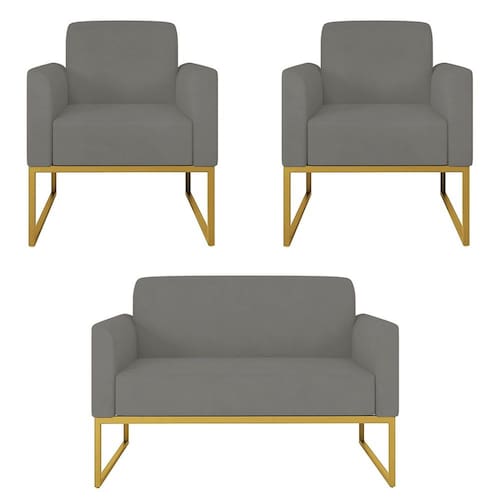 O momento em que decidimos mobiliar nossa casa é um evento muito especial, pois representa o que gostamos e o que irá refletir através dos móveis que irão compor cada espaço do nosso Lar.Cada escolha é uma oportunidade de imprimir o que sentimos, e para Sala de Estar desejamos conforto e beleza, para a hora de um bate-papo ou um belo café da tarde. O Kit Namoradeira e 1 Poltrona Decorativa Base Industrial Preta Maressa S08 Suede Grafite - Ibiza pode transformar seu ambiente em algo único, sua estrutura em metal é firme e com fino acabamento, o estofado é macio e traz a leveza que o Estilo Industrial pode fazer em sua essência.Faça uma escolha inteligente e adquira conosco este Conjunto de Poltrona Namoradeira e Poltrona Decorativa, um toque de classe para o seu cantinho favorito.EspecificaçõesDimensões do Produto:Poltrona (L x A x P): 65 x 77 x 64 cm.Namoradeira (L x A x P): 113 x 76 x 64 cm.Profundidade do assento: 46 cm.Largura do assento: 95 cm.Altura do assento ao chão: 44 cm.Altura do encosto: 35 cm.Altura Interna do Braço: 18 cm.Altura dos pés: 30 cm.Peso: 33 kg.Características do ProdutoMaterial da Estrutura: Madeira reflorestada de Eucalipto..Material da Espuma: Espuma D-28 no assento e encosto e D-23 nos braços..Peso Suportado: Até 360 Kg.Revestimento: Suede.Tipo de Encosto: Fixo.Tipo de Assento: Fixo.Quantidade de Lugares: 3 Lugares.Possui Pés: Sim.Material dos Pés: Base Industrial.Diferenciais:- Design moderno.- Percintas elásticas no assento.Sistema de Montagem: O produto é enviado montado, sendo necessário apenas fixar a base.Volumes: 3 Volumes.Conteúdo da Embalagem: 1 Namoradeira e 1 Poltrona Decorativa.Garantia do Fabricante: 90 dias contra defeito de fabricação.Montagem: Recomendamos que seja feita por um profissional.Recomendação de Limpeza: Utilize pano levemente úmido.Observações importantes:- Produto para uso residencial em ambiente interno, não devendo ficar exposto diretamente ao sol, calor e umidades excessivas.- Pode haver alguma diferença de tonalidade entre a imagem e o produto real, por conta do tratamento de imagens e a calibração de cores do seu monitor.- As imagens são meramente ilustrativas, não acompanham objetos de decoração e eletrônicos.- Confira o estado da embalagem, não devendo assinar o comprovante em caso de danos.- Não asseguramos, no ato da entrega, por subir escadas/elevadores, pelo transporte por guincho em apartamentos ou montagem, desmontagem e instalações. Eventuais despesas são por conta do comprador.- Confira as dimensões do produto e certifique-se de que passará normalmente por supostos elevadores, portas, escadas e/ou corredores de sua residência.