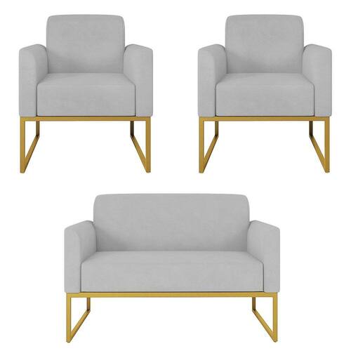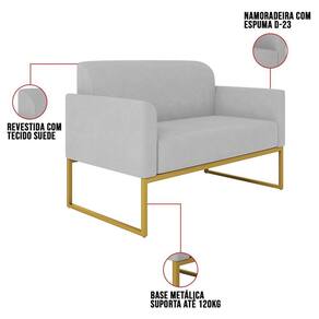 O momento em que decidimos mobiliar nossa casa é um evento muito especial, pois representa o que gostamos e o que irá refletir através dos móveis que irão compor cada espaço do nosso Lar.Cada escolha é uma oportunidade de imprimir o que sentimos, e para Sala de Estar desejamos conforto e beleza, para a hora de um bate-papo ou um belo café da tarde. O Kit Namoradeira e 2 Poltronas Decorativas Base Industrial Dourada Maressa S10 Suede Cinza - Ibiza pode transformar seu ambiente em algo único, sua estrutura em metal é firme e com fino acabamento, o estofado é macio e traz a leveza que o Estilo Industrial pode fazer em sua essência.Faça uma escolha inteligente e adquira conosco este Conjunto de Poltrona Namoradeira e Poltrona Decorativa, um toque de classe para o seu cantinho favorito.EspecificaçõesDimensões do Produto (Largura x Altura x Profundidade):Namoradeira: 113 x 76 x 64 cm.Poltronas: 65 x 77 x 64 cm.Peso: 46 kg.Outras MedidasProfundidade do assento: 46 cm.Largura do assento: 95 cm.Altura do assento ao chão: 44 cm.Altura do encosto: 35 cm.Altura Interna do Braço: 18 cm.Altura dos pés: 30 cm.Características do ProdutoMaterial da Estrutura: Madeira reflorestada de Eucalipto..Material da Espuma: Espuma D-28 no assento e encosto e D-23 nos braços..Peso Suportado: Até 480 Kg.Revestimento: Suede.Tipo de Encosto: Fixo.Tipo de Assento: Fixo.Quantidade de Lugares: 4 Lugares.Possui Pés: Sim.Material dos Pés: Base Industrial.Diferenciais:- Design moderno.- Percintas elásticas no assento.Sistema de Montagem: O produto é enviado montado, sendo necessário apenas fixar a base.Volumes: 4 Volumes.Conteúdo da Embalagem: 1 Namoradeira e 2 Poltronas Decorativas.Garantia do Fabricante: 90 dias contra defeito de fabricação.Montagem: Recomendamos que seja feita por um profissional.Recomendação de Limpeza: Utilize pano levemente úmido.Observações importantes:- Produto para uso residencial em ambiente interno, não devendo ficar exposto diretamente ao sol, calor e umidades excessivas.- Pode haver alguma diferença de tonalidade entre a imagem e o produto real, por conta do tratamento de imagens e a calibração de cores do seu monitor.- As imagens são meramente ilustrativas, não acompanham objetos de decoração e eletrônicos.- Confira o estado da embalagem, não devendo assinar o comprovante em caso de danos.- Não asseguramos, no ato da entrega, por subir escadas/elevadores, pelo transporte por guincho em apartamentos ou montagem, desmontagem e instalações. Eventuais despesas são por conta do comprador.- Confira as dimensões do produto e certifique-se de que passará normalmente por supostos elevadores, portas, escadas e/ou corredores de sua residência.