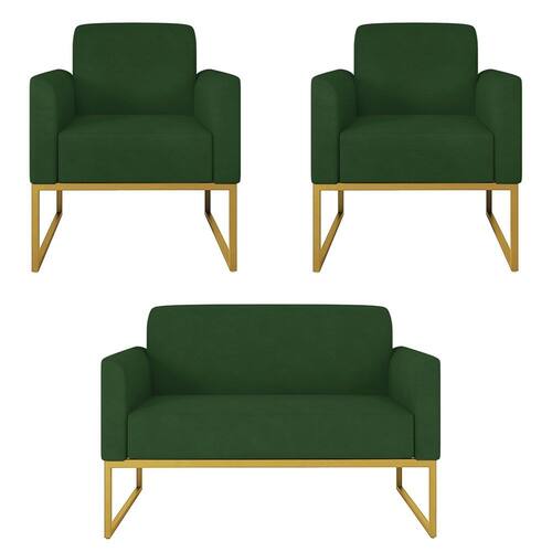 O momento em que decidimos mobiliar nossa casa é um evento muito especial, pois representa o que gostamos e o que irá refletir através dos móveis que irão compor cada espaço do nosso Lar.Cada escolha é uma oportunidade de imprimir o que sentimos, e para Sala de Estar desejamos conforto e beleza, para a hora de um bate-papo ou um belo café da tarde. O Kit Namoradeira e 2 Poltronas Decorativas Base Industrial Dourada Maressa S23 Suede Verde - Ibiza pode transformar seu ambiente em algo único, sua estrutura em metal é firme e com fino acabamento, o estofado é macio e traz a leveza que o Estilo Industrial pode fazer em sua essência.Faça uma escolha inteligente e adquira conosco este Conjunto de Poltrona Namoradeira e Poltrona Decorativa, um toque de classe para o seu cantinho favorito.EspecificaçõesDimensões do Produto:Poltrona (L x A x P): 65 x 77 x 64 cm.Namoradeiras (L x A x P): 113 x 76 x 64 cm.Profundidade do assento: 46 cm.Largura do assento: 95 cm.Altura do assento ao chão: 44 cm.Altura do encosto: 35 cm.Altura Interna do Braço: 18 cm.Altura dos pés: 30 cm.Peso: 46 kg.Características do ProdutoMaterial da Estrutura: Madeira reflorestada de Eucalipto..Material da Espuma: Espuma D-28 no assento e encosto e D-23 nos braços..Peso Suportado: Até 480 Kg.Revestimento: Suede.Tipo de Encosto: Fixo.Tipo de Assento: Fixo.Quantidade de Lugares: 4 Lugares.Possui Pés: Sim.Material dos Pés: Base Industrial.Diferenciais:- Design moderno.- Percintas elásticas no assento.Sistema de Montagem: O produto é enviado montado, sendo necessário apenas fixar a base.Volumes: 4 Volumes.Conteúdo da Embalagem: 1 Namoradeira e 2 Poltronas Decorativas.Garantia do Fabricante: 90 dias contra defeito de fabricação.Montagem: Recomendamos que seja feita por um profissional.Recomendação de Limpeza: Utilize pano levemente úmido.Observações importantes:- Produto para uso residencial em ambiente interno, não devendo ficar exposto diretamente ao sol, calor e umidades excessivas.- Pode haver alguma diferença de tonalidade entre a imagem e o produto real, por conta do tratamento de imagens e a calibração de cores do seu monitor.- As imagens são meramente ilustrativas, não acompanham objetos de decoração e eletrônicos.- Confira o estado da embalagem, não devendo assinar o comprovante em caso de danos.- Não asseguramos, no ato da entrega, por subir escadas/elevadores, pelo transporte por guincho em apartamentos ou montagem, desmontagem e instalações. Eventuais despesas são por conta do comprador.- Confira as dimensões do produto e certifique-se de que passará normalmente por supostos elevadores, portas, escadas e/ou corredores de sua residência.