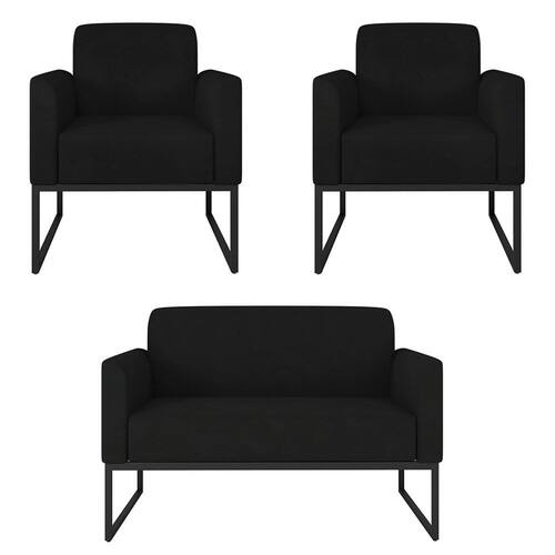 O momento em que decidimos mobiliar nossa casa é um evento muito especial, pois representa o que gostamos e o que irá refletir através dos móveis que irão compor cada espaço do nosso Lar.Cada escolha é uma oportunidade de imprimir o que sentimos, e para Sala de Estar desejamos conforto e beleza, para a hora de um bate-papo ou um belo café da tarde. O Kit Namoradeira e 2 Poltronas Decorativas Base Industrial Preta Maressa S07 Suede Preto - Ibiza pode transformar seu ambiente em algo único, sua estrutura em metal é firme e com fino acabamento, o estofado é macio e traz a leveza que o Estilo Industrial pode fazer em sua essência.Faça uma escolha inteligente e adquira conosco este Conjunto de Poltrona Namoradeira e Poltrona Decorativa, um toque de classe para o seu cantinho favorito.EspecificaçõesDimensões do Produto (Largura x Altura x Profundidade):Namoradeira: 113 x 76 x 64 cm.Poltronas: 65 x 77 x 64 cm.Peso: 46 kg.Outras MedidasProfundidade do assento: 46 cm.Largura do assento: 95 cm.Altura do assento ao chão: 44 cm.Altura do encosto: 35 cm.Altura Interna do Braço: 18 cm.Altura dos pés: 30 cm.Características do ProdutoMaterial da Estrutura: Madeira reflorestada de Eucalipto..Material da Espuma: Espuma D-28 no assento e encosto e D-23 nos braços..Peso Suportado: Até 480 Kg.Revestimento: Suede.Tipo de Encosto: Fixo.Tipo de Assento: Fixo.Quantidade de Lugares: 4 Lugares.Possui Pés: Sim.Material dos Pés: Base Industrial.Diferenciais:- Design moderno.- Percintas elásticas no assento.Sistema de Montagem: O produto é enviado montado, sendo necessário apenas fixar a base.Volumes: 4 Volumes.Conteúdo da Embalagem: 1 Namoradeira e 2 Poltronas Decorativas.Garantia do Fabricante: 90 dias contra defeito de fabricação.Montagem: Recomendamos que seja feita por um profissional.Recomendação de Limpeza: Utilize pano levemente úmido.Observações importantes:- Produto para uso residencial em ambiente interno, não devendo ficar exposto diretamente ao sol, calor e umidades excessivas.- Pode haver alguma diferença de tonalidade entre a imagem e o produto real, por conta do tratamento de imagens e a calibração de cores do seu monitor.- As imagens são meramente ilustrativas, não acompanham objetos de decoração e eletrônicos.- Confira o estado da embalagem, não devendo assinar o comprovante em caso de danos.- Não asseguramos, no ato da entrega, por subir escadas/elevadores, pelo transporte por guincho em apartamentos ou montagem, desmontagem e instalações. Eventuais despesas são por conta do comprador.- Confira as dimensões do produto e certifique-se de que passará normalmente por supostos elevadores, portas, escadas e/ou corredores de sua residência.