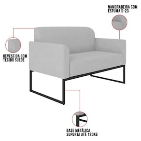 O momento em que decidimos mobiliar nossa casa é um evento muito especial, pois representa o que gostamos e o que irá refletir através dos móveis que irão compor cada espaço do nosso Lar.Cada escolha é uma oportunidade de imprimir o que sentimos, e para Sala de Estar desejamos conforto e beleza, para a hora de um bate-papo ou um belo café da tarde. O Kit Namoradeira e 2 Poltronas Decorativas Base Industrial Preta Maressa S10 Suede Cinza - Ibiza pode transformar seu ambiente em algo único, sua estrutura em metal é firme e com fino acabamento, o estofado é macio e traz a leveza que o Estilo Industrial pode fazer em sua essência.Faça uma escolha inteligente e adquira conosco este Conjunto de Poltrona Namoradeira e Poltrona Decorativa, um toque de classe para o seu cantinho favorito.EspecificaçõesDimensões do Produto (Largura x Altura x Profundidade):Namoradeira: 113 x 76 x 64 cm.Poltronas: 65 x 77 x 64 cm.Peso: 46 kg.Outras MedidasProfundidade do assento: 46 cm.Largura do assento: 95 cm.Altura do assento ao chão: 44 cm.Altura do encosto: 35 cm.Altura Interna do Braço: 18 cm.Altura dos pés: 30 cm.Características do ProdutoMaterial da Estrutura: Madeira reflorestada de Eucalipto..Material da Espuma: Espuma D-28 no assento e encosto e D-23 nos braços..Peso Suportado: Até 480 Kg.Revestimento: Suede.Tipo de Encosto: Fixo.Tipo de Assento: Fixo.Quantidade de Lugares: 4 Lugares.Possui Pés: Sim.Material dos Pés: Base Industrial.Diferenciais:- Design moderno.- Percintas elásticas no assento.Sistema de Montagem: O produto é enviado montado, sendo necessário apenas fixar a base.Volumes: 4 Volumes.Conteúdo da Embalagem: 1 Namoradeira e 2 Poltronas Decorativas.Garantia do Fabricante: 90 dias contra defeito de fabricação.Montagem: Recomendamos que seja feita por um profissional.Recomendação de Limpeza: Utilize pano levemente úmido.Observações importantes:- Produto para uso residencial em ambiente interno, não devendo ficar exposto diretamente ao sol, calor e umidades excessivas.- Pode haver alguma diferença de tonalidade entre a imagem e o produto real, por conta do tratamento de imagens e a calibração de cores do seu monitor.- As imagens são meramente ilustrativas, não acompanham objetos de decoração e eletrônicos.- Confira o estado da embalagem, não devendo assinar o comprovante em caso de danos.- Não asseguramos, no ato da entrega, por subir escadas/elevadores, pelo transporte por guincho em apartamentos ou montagem, desmontagem e instalações. Eventuais despesas são por conta do comprador.- Confira as dimensões do produto e certifique-se de que passará normalmente por supostos elevadores, portas, escadas e/ou corredores de sua residência.