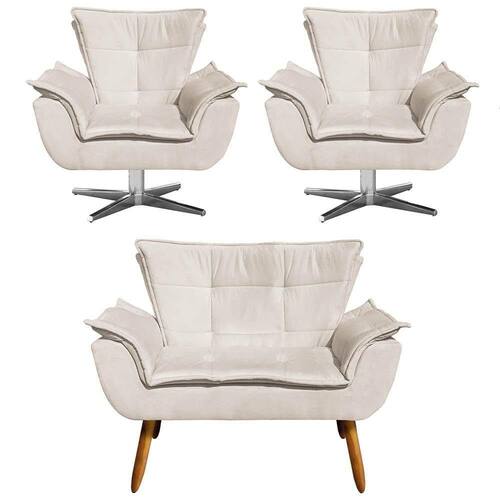 O Kit 2 Poltronas Decorativas e o Namoradeira Opla são mais do que complementos, são justamente para te oferecer aconchego e praticidade. Ela são produtos super versáteis, proporcionando conforto e elegância. Podem ser utilizadas na sala de estar, quarto, escritório ou recepção, afinal seu design retrô combina com qualquer ambiente. Estrutura em madeira de eucalipto e espuma de alta qualidade, tudo para garantir durabilidade e resistência. Ah, percintas elásticas deixam o assento ainda mais reforçado e seu revestimento em tecido Suede transmite maciez ao toque. Show, concorda?
