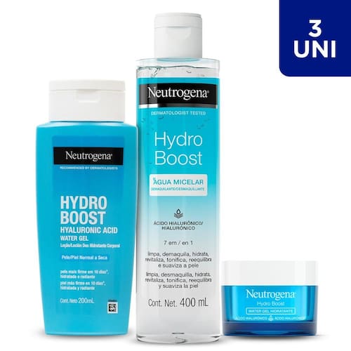O Kit contém: - 1 Hidratante Corporal Neutrogena Hydro Boost Water Gel 200ml; - 1 Hidratante Facial Neutrogena Hydro Boost Water Gel 50g; - 1 Água Micelar Demaquilante Neutrogena Hydro Boost 400ml;