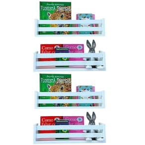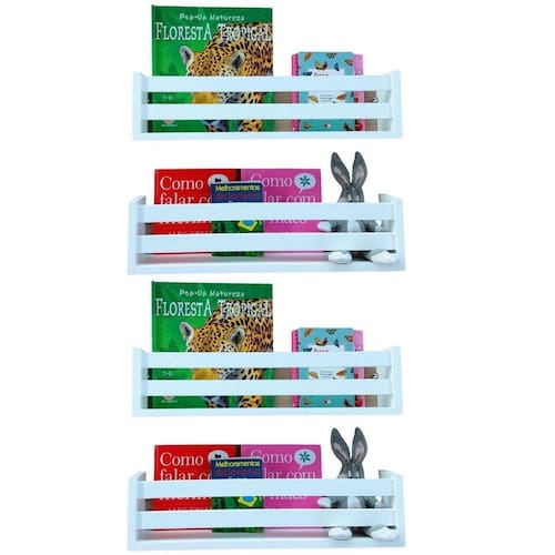 Kit 4 prateleiras modelo livros, brinquedos e multiuso. 2 ripas frontais. Kit de instalação do produto.