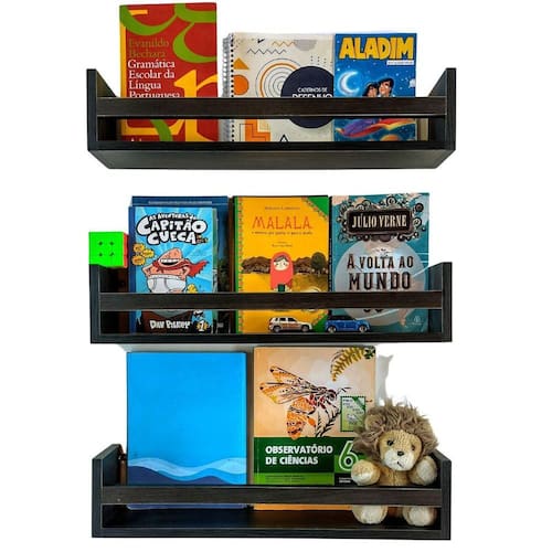 Kit De Nichos Porta Livros Criança Prateleira Organizadora De Brinquedos Mdf Preto 3Pçs 55cm Prateleiras enviadas montadas para você, de acabamento perfeito. Qualidade comprovada por nossos clientes Fabricação Arte Cedro decor O que vem: Kit 3 prateleiras porta livros, brinquedos e multiuso. Exclusivo preto madeirado, mais beleza e sofisticação Kit instalação do produto. Decora e organiza os ambientes. Pode ser instalado em várias posições de acordo com sua necessidade. Produto perfeito para qualquer área. No quarto pode ser Utilizado como porta livros, pelúcias, brinquedos, enfeites. No banheiro como porta xampu, cosméticos, papel higiênico. Pode ser também fixado invertido para funcionar como cabideiro ou porta toalha. Na cozinha é utilizado como porta temperos, condimentos, potes, etc. Estante muito versátil, com uma infinidade de possibilidades para toda sua casa. Fácil instalação, bastando fixar na parede. Suporta até 8 kilos. Material 100% MDF 15 mm. Acabamento real do mdf, superior á pintura em qualidade e durabilidade Produzido com fita de borda em PVC, incomparável ás de papel utilizadas no mercado MEDIDAS 55 CM comprimento. 12 CM altura. 10 CM largura. Marca: Arte Cedro Ean: 7790011400359