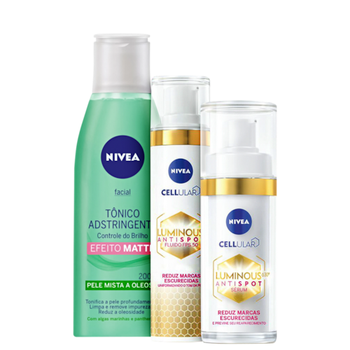 Kit NIVEA Controle do Brilho & Cellular Luminous 630 Antispot ajuda a tonificar a pele, remover as impurezas e controlar o brilho e a oleosidade; além de atuar na redução de manchas existentes e evitar o seu reaparecimento, deixando a pele mais uniforme e luminosa.