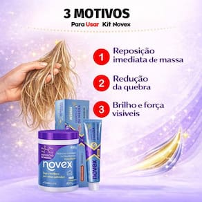 Creme De Tratamento: Lave os cabelos: utilize um shampoo da Novex de sua preferência e enxágue bem. Aplique o creme: com os cabelos úmidos, aplique uma quantidade generosa do Creme de Tratamento Novex Reposição de Massa mecha por mecha, desde a raiz até as ponta. Massageie e deixe agir: massageie suavemente e deixe o produto agir por 3 minutos para uma hidratação rápida. Para um tratamento mais profundo, deixe por 10 minutos. Enxágue: retire todo o produto com água abundante. Finalize como desejar: finalize com secador, prancha ou deixe secar naturalmente.