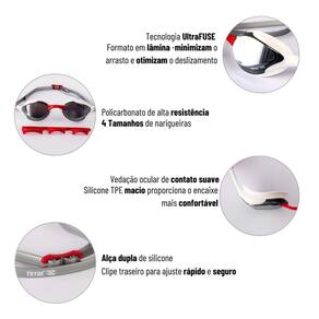 Óculos de Natação PRO VISION TRYDEA escolha perfeita para quem busca desempenho e conforto, seja em competições ou treinamentos. Com design de última geração, os PRO VISION TRYDE oferecem um ajuste ultraconfortável graças às suas juntas de precisão. Suas lentes espelhadas cor fume de baixo perfil, combinadas com a tecnologia UltraFUSE e o formato em lâmina, minimizam o arrasto e otimizam o deslizamento, criando um design elegante e totalmente à prova d'água. Com proteção UV, antiembaçante, lentes espelhados, ultrafit. O formato curvo das lentes amplia a visão periférica e frontal, proporcionando um campo de visão significativamente expandido. Fabricadas em policarbonato de alta resistência e revestidas com proteção antiembaçante, as lentes garantem visibilidade clara e segura debaixo d'água. Equipados com alça dupla de silicone, narigueiras intercambiáveis e um clipe traseiro, os PRO VISION proporcionam um ajuste personalizado e seguro. As fivelas laterais reforçam a resistência e durabilidade, conectando a alça ao quadro de forma eficaz. Mergulhe com confiança, sabendo que está usando óculos que combinam conforto, segurança e desempenho incomparáveis. Tecnologia UltraFUSEA tecnologia UltraFUSE torna o design mais elegante, aumenta o conforto, reduz a pressão ao redor dos olhos e previne vazamentos. Conforto TotalO TPE macio oferece o encaixe mais confortável possível. Ajuste PersonalizadoDisponível com quatro tamanhos de narigueiras intercambiáveis (XS, S, M, L) para garantir o melhor ajuste. Estabilidade MáximaA alça dupla de silicone proporciona fixação segura, ideal para competições de alta intensidade.