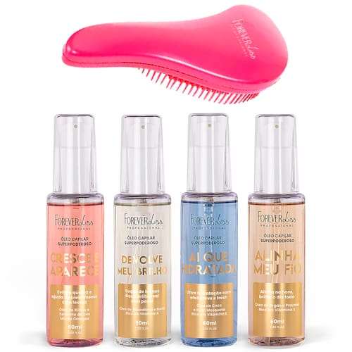 Contém 01 - Óleo Capilar Superpoderoso Ai que Hidratada Forever Liss 60 ml01 - Óleo Capilar Superpoderoso Alinha Meu Fio Forever Liss 60 ml01 - Óleo Capilar Superpoderoso Cresce e Aparece Forever Liss 60 ml01 - Óleo Capilar Superpoderoso Devolve Meu Brilho Forever Liss 60 ml01 - Escova Desembaraçadora Forever Liss Resultado