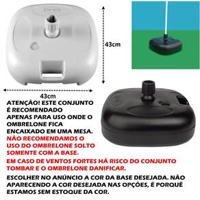 (BASE PLÁSTICA GUARDA SOL) - Marca: Mor - Material: Polipropileno - Capacidade: 18l de água ou 22kg de areia - A base tem compatibilidade com hastes de ø19mm a ø38mm. - Dimensões: (C) 43,4cm x (L) 42,5cm x (A) 22,4cm / Peso: 950g