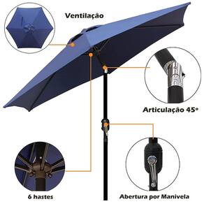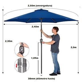 (OMBRELONE IPANEMA 6 HASTES COM MANIVELA – 2,5 METROS) - Marca: AMZ - Cobertura: Tecido Poliéster-AZUL - Estrutura: Em Aço Carbono com Pintura Eletrostática a Pó - Medida Haste (diâmetro tubo): Ø38mm - Medida aberto: Altura 2,30 metros x Diâmetro 2,40 metros - Medida fechado (desmontado): Altura 1,23 metros x Diâmetro 15cm - Envergadura: 2,50 metros (medida oficial no Brasil) - Peso: 4,9Kg