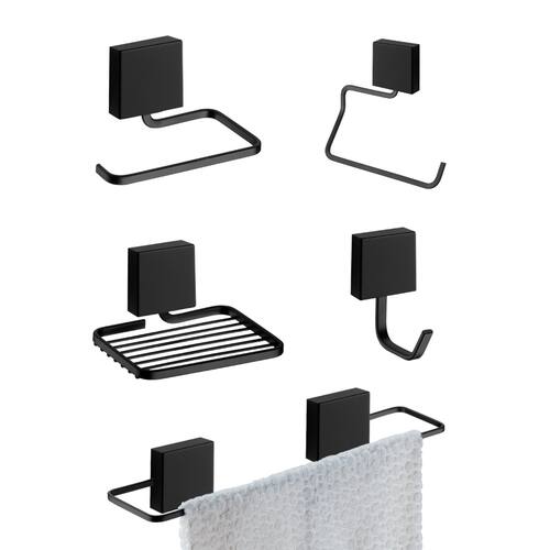 - Saboneteira adesiva (1 unidade); - Suporte para toalha de banho (1 unidade); - Suporte para toalha de rosto (1 unidade); - Suporte para papel higiênico (1 unidade); - Gancho multiuso(1 unidade).