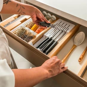 Kit Organizador de Gaveta com 01 Porta Temperos + 01 Organizador Talheres + 01 Organizador de Facas em Bambu Ou - Itens inclusos01 Organizador de Temperos Keep Bambu 10 Peças 100 ml Ou