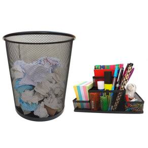 Kit organizador de mesa e lixeira de escritório Kit: preto Kit escritório com 2 unidades Para quem gosta de ter tudo sempre à mão, com agilidade e praticidade. O kit de organizador de mesa e a lixeira de escritório é ideal para você.Com eles, você vai evitar a perda de tempo procurando os itens de que precisa e que usa com frequência. Tudo estará a sua mão. O organizador de mesa de escritório tem 4 partes com tamanhos variados. permitindo organiza canetas, lápis, clips, bloco de notas e pequenos objetos. Kit escritório composto por:- 01 organizador de mesa escritório com 4 partições - 01 lixeira aramada Material: metal - organizador de mesa escritório tamanho: 20x10x10cm largura x altura x comprimento - lixeira tamanho: 27x23,5x18,5cm altura x diâmetro da boca x diâmetro da base Marca: Markys Store