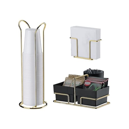 Material (Aramado): Aço CarbonoMaterial (Potes): PlásticoCor/Acabamento (Aramado): Dourado BrilhosoCor/Acabamento (Potes): Preto FoscoPorta copos de 200ml (copos de 6,9cm de diâmetro máximo)Medidas e Peso: