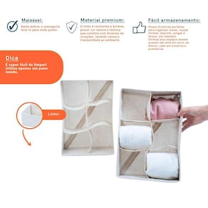 Esse é o Kit organizador dobrável divisórias linho offwhite c/2-OikosEsse kit contém:2 Organizadores dobráveis com 6 divisórias quadradas linho – OikosEsses são os organizadores dobráveis com 6 divisórias quadradas linho off white da OIKOS.Cabe de tudo: dá para colocar gravatas, roupas íntimas, meias, biquínis, sungas, lenços e mais!Funcional: suas peças organizadas e visíveis, tudo ao alcance da sua mão!Material premium: além de ser resistente e durável, o linho ainda tem uma cor neutra e uma textura que combina com diversas decorações, trazendo calma e tranquilidade para casa.Versátil: vai bem em diferentes ambientes. do quarto ao banheiro, da lavanderia à cozinha :)Dobrável: economiza espaço mesmo quando não está em uso. simples de guardar e transportar para onde quiser.Fácil de limpar: é só passar pano úmido e nada mais!
