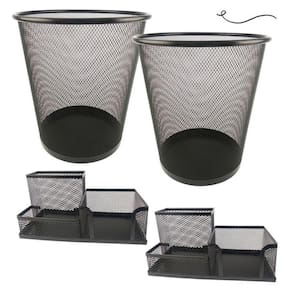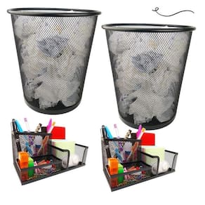 Kit organizador de mesa escritório e lixeira aramada home office preto Kit escritório com 4 unidades Para quem gosta de ter tudo sempre à mão, com agilidade e praticidade. O kit de organizador de mesa e a lixeira de escritório é ideal para você.Com eles, você vai evitar a perda de tempo procurando os itens de que precisa e que usa com frequência. Tudo estará a sua mão. O organizador de mesa de escritório tem 3 partições com tamanhos variados. Permitindo organiza canetas, lápis, clips, bloco de notas e pequenos objetos. Kit escritório composto por:- 02 organizadores de mesa escritório com 3 partições- 02 lixeiras aramada Material: metal - organizador de mesa escritórioTamanho: 20x10x10cm largura x altura x comprimento - lixeiraTamanho: 27x23,5x18,5cm altura x diâmetro da boca x diâmetro da base
