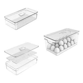 ASPEN DECOR F6259 01 - Organizador De Ovos Clear Fresh 36 UN Porta Ovos Com Tampa E Alças Laterais. 02 - Organizador De Geladeira 2,8 Litros com Drenagem Com Respiradouro. Refletindo praticidade e funcionalidade, o Organizador de Ovos com Tampa da linha Clear Fresh dispõe de bandeja interna removível com 18 cavidades proporcionando o empilhamento de até 36 ovos com segurança e permitindo o fluxo de ar interno, melhorando a conservação e evitando a deterioração precoce dos ovos. Peso: 505g Dimensões: 30cm C x 15cm L x 13cm A Quantidade De Grades: 1 Grade com 18 cavidades. Capacidade: 36 Ovos. Com o organizador de geladeira Clear Fresh, você terá organização e irá conservar e manter o frescor de seus alimentos por mais tempo, a tampa com ventilação ajustável mantém o nível de umidade ideal para cada tipo de alimento, mantendo-os frescos por mais tempo. Possui bandeja de drenagem que impede que a umidade acumulada se mantenha no alimento, evitando o murchamento e deterioração precoce. Especificações Dimensões totais: 30,3cm C x 15,3cm L x 7,5cm A Capacidade: 2,8 Litros Cor: Natural e Branco Peso: 340g