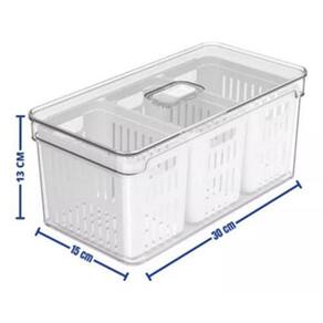 ASPEN DECOR F6278 KIT com 02 Organizador com Cesto Triplo 5L Clear Fresh - OU O organizador de geladeira Clear Fresh com cesto triplo 5L promove frescor prolongado para os alimentos, para uma rotina mais saudável e sem desperdícios. O sistema de ventilação mantém o nível de umidade ideal para cada alimento. A armazenagem com cestos evita que as frutas, verduras e legumes fiquem molhados após a lavagem, aumentando a durabilidade dos alimentos. Sinta o frescor de uma vida leve, saudável e organizada. Sua transparência facilita a visualização dos alimentos e a organização do ambiente. Produzido em material resistente PS Transparente , o organizador garante durabilidade, praticidade e fácil higienização. Transparência, beleza e cuidado com o alimento são características da linha Clear Fresh, perfeitas para auxiliar na organização da sua geladeira e facilitar o seu dia a dia. Livre de BPA. Lavar com sabão neutro e esponja macia. -não levar ao micro-ondas -não levar ao freezer -não levar à lava-louças Contém: 2 cesto com tampa 6 cestos independentes Medidas: 15 x 30 x 13cm Marca: Ou Garantia do vendedor: 90 dias