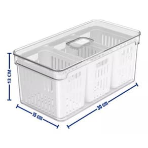 ASPEN DECOR F6278 KIT com 02 Organizador com Cesto Triplo 5L Clear Fresh - OU O organizador de geladeira Clear Fresh com cesto triplo 5L promove frescor prolongado para os alimentos, para uma rotina mais saudável e sem desperdícios. O sistema de ventilação mantém o nível de umidade ideal para cada alimento. A armazenagem com cestos evita que as frutas, verduras e legumes fiquem molhados após a lavagem, aumentando a durabilidade dos alimentos. Sinta o frescor de uma vida leve, saudável e organizada. Sua transparência facilita a visualização dos alimentos e a organização do ambiente. Produzido em material resistente PS Transparente , o organizador garante durabilidade, praticidade e fácil higienização. Transparência, beleza e cuidado com o alimento são características da linha Clear Fresh, perfeitas para auxiliar na organização da sua geladeira e facilitar o seu dia a dia. Livre de BPA. Lavar com sabão neutro e esponja macia. -não levar ao micro-ondas -não levar ao freezer -não levar à lava-louças Contém: 2 cesto com tampa 6 cestos independentes Medidas: 15 x 30 x 13cm Marca: Ou do vendedor: 90 dias Marca: Não Informado
