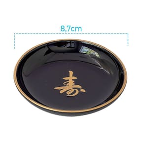 Kit oriental com acabamento preto laqueado de excelente qualidade, alto brilho e pintura do ideograma em dourado que representa felicidade. Peças indispensáveis para amantes da culinária oriental. Cores fortes inspiradoras nas tradicionais decorações japonesas podendo auxiliar no serviço de sushis, sashimis e outras iguarias. Cuidados: - Lavar com água morna e sabão neutro utilizando esponja macia, seguido de pano seco. - Não utilizar produtos químicos ou abrasivos na limpeza. - Não vai à lava-louças.