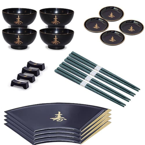 - 4 x Unidades de Molheiras - 4 x Unidades de Prato Leque - 4 x Unidades de Hashi Coloridos - 4 x Unidades de Descanso para Hashi - 4 x Unidades de Tigelas 12x6cm