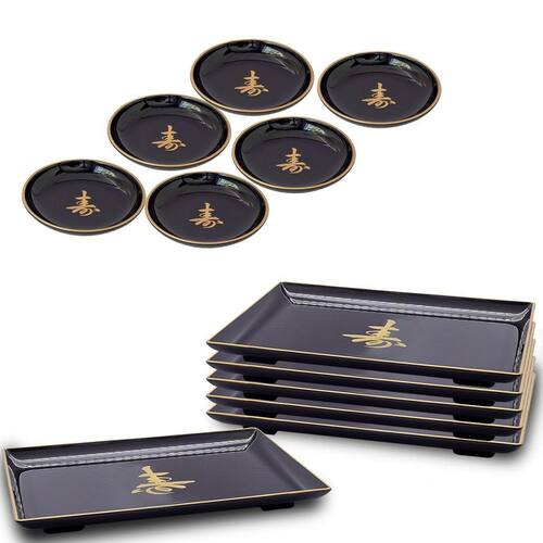 Kit oriental com acabamento preto laqueado de excelente qualidade, alto brilho e pintura do ideograma em dourado que representa felicidade. Peças indispensáveis para amantes da culinária oriental. Cores fortes inspiradoras nas tradicionais decorações japonesas podendo auxiliar no serviço de sushis, sashimis e outras iguarias. Cuidados: - Lavar com água morna e sabão neutro utilizando esponja macia, seguido de pano seco. - Não utilizar produtos químicos ou abrasivos na limpeza. - Não vai à lava-louças.