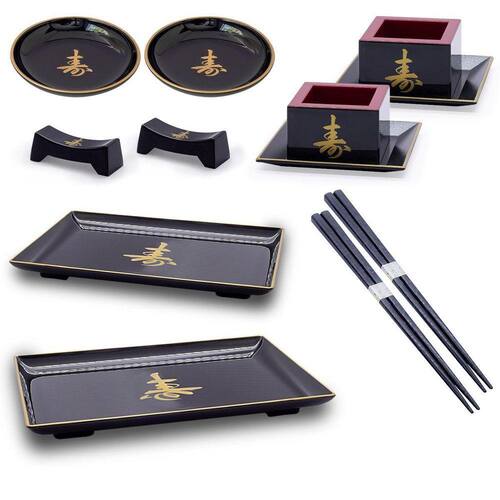 Kit Oriental japonês Sushi Sashimi Para 2 PessoasDescrição:Jogo de jantar oriental com acabamento preto laqueado de excelente qualidade, alto brilho e pintura do ideograma em dourado que representa felicidade. Peças indispensáveis para amantes da culinária oriental. Cores fortes inspiradoras nas tradicionais decorações japonesas podendo auxiliar no serviço de sushis, sashimis e outras iguarias. Cuidados:- Lavar com água morna e sabão neutro utilizando esponja macia, seguido de pano seco.- Não utilizar produtos químicos ou abrasivos na limpeza. - Não vai à lava-louças.Características: Descanso Hashi:Altura:2,2cmLargura: 1,8cmComprimento: 5,4cmMolheira:Altura: 1,7cmLargura: 8,7cmComprimento: 8,7cmCopo de Saque:Altura: 5cmLargura: 8cmComprimento: 8cmPeso: 0,80kgCapacidade: 150MLPrato Saque:Espessura: 8mmLargura: 11,6cmComprimento:11,6cmPrato Retangular:Altura: 2cmLargura: 13,5Comprimento: 19cmHashi:Espessura: 1cmComprimento: 21cmComposição: A.B.SConteúdo:- 2 x Unidades de Molheiras- 2 x Unidades de Descanso para Hashi- 2 x Unidades de Copo para saque- 2 x Unidades de Prato para Saque- 2 x Prato Retangular - 2 x Hashi Cód.: 779/955/1105/730/774/935SKU: TB001538