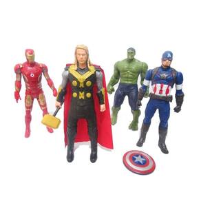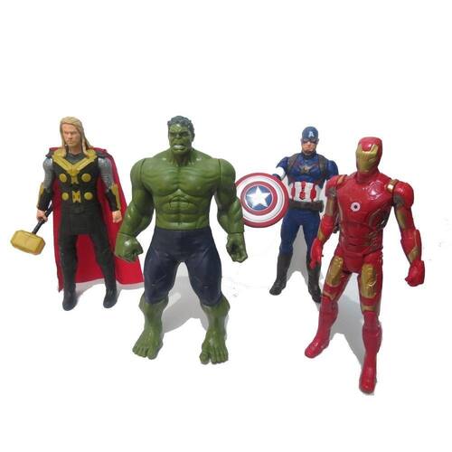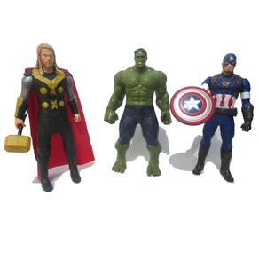 Kit Bonecos Os Vingadores Coleção com 4 Personagens . Bonecos de 30 cm Musicais . Personagens :Hulk - Capitão América - Thor - Homem de Ferro . Material : Pvc Comodity de Alta Resistencia . Bonecos Embaldos Individualmente em Caixa Separadas . Contém Acessórios : Martelo Thor e Escudo Capitão America . Boneco Thor com Capa Feita em Tecido Poliéster .