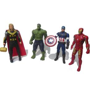 Kit Bonecos Os Vingadores Coleção com 4 Personagens . Bonecos de 30 cm Musicais . Personagens :Hulk - Capitão América - Thor - Homem de Ferro . Material : Pvc Comodity de Alta Resistencia . Bonecos Embaldos Individualmente em Caixa Separadas . Contém Acessórios : Martelo Thor e Escudo Capitão America . Boneco Thor com Capa Feita em Tecido Poliéster .