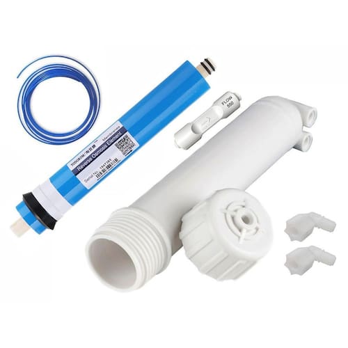 Kit para ser em conjunto com filtro deionizador. Estágio de Reverse Osmose. Itens: - Carcaça para Membrana Reverso Osmose - Membrana de 100gpd 390 litros diários - Dois clips para fixar a carcaça da membrana - Furo calibrado reduz o descarte - 2 parafusos para fixar os clips no suporte - 2,5 metros de mangueira para o descarte. - 3 conectores já na carcaça de membrana - 1 metro de mangueira branca para adaptação kit a seu deionizador Marca: Não Informado