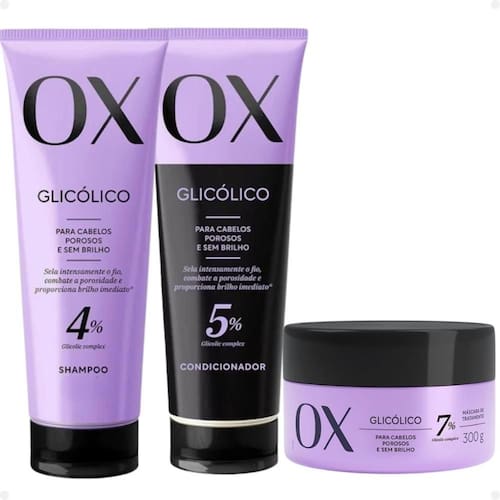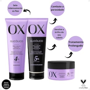 A linha Ox Glicólico é a ideal para cabelos porosos e sem brilho. Isso porque o Glicolic complex combinado ao sistema Ox Bela Duradoura, é a fórmula certa para selar intensamente os fios, combater a porosidade e proporcionar brilho imediato.O sistema Ox é uma tecnologia exclusiva, capaz de liberar sequencialmente os ingredientes, proporcionando um tratamento prologado aos fios.