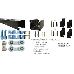 • Acompanha: - 02 Roldanas Côncava - 4R até 80kg - 02 Parador Prático - 01 Guia baixo alumínio - 02 Trilho Superior de 90cm cada. - 04 Suporte e emenda externo alumínio - Parafusos para Aplicação