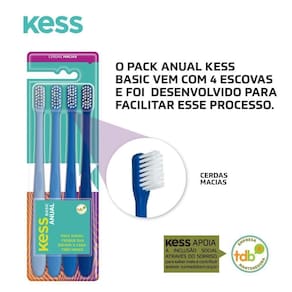 Kit Pack Anual c/ 4 Escovas Dentais Basic Kess Cerdas Macias