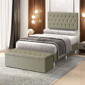 Características do Produto: Madeira de eucalipto proveniente de reflorestamento Fixação com grampos galvanizados Espuma Poliuretano D20 Tamanho: King Fixação na parede via suportes metálicos. Embalagem: papelão ondulado, malha e plástico Garantia de 3 meses contra defeitos de fábrica.