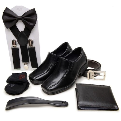 O kit é composto por 01 par de sapato, 01 cinto, 01 carteira, 01 meia, 01 suspensório e 01 calçadeira